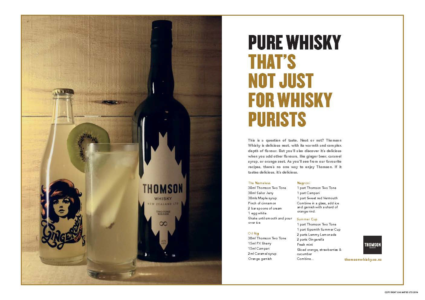 Here's some ideas we created for Thomson Whiskey. They were created speculatively for this great brand, who liked them a lot, but couldn't run them. We liked them too and it seemed a pity to leave them in a bottom drawer. The lovely photos used were taken by Thomsons